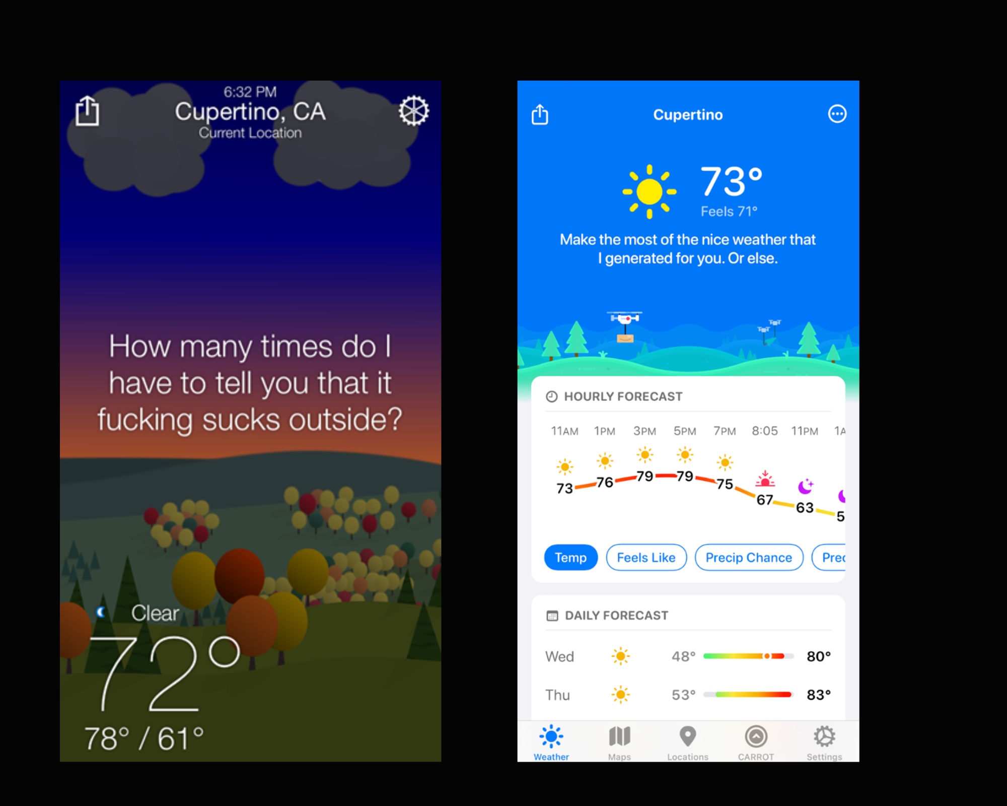 Wenn du nicht mehr brauchst als das, was eine normale Wetter-App bietet, aber dafür gern ein bisschen mehr Kreativität und Witz in deiner täglichen Vorhersage hättest, dann gibt es zwei Apps, die wir dir besonders empfehlen können: Carrot Weather und What The Forecast.